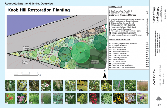 In the late spring of 2019, the triangle of land that forms the southeast tip of Knob Hill underwent a drastic transformation as part of a stormwater mitigation project by the Town of Great Barrington. The privately owned 2,400 square foot area at the bottom of the slope was stripped of vegetation and excavated to install new drains, basins, and underground piping. Though this project was a critical long-term investment for both the town and the lake, the loss of mature forest trees and associated understory vegetation was felt by the local human community and broader ecological community.